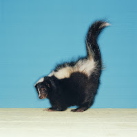 I almost passed out. I hate skunks!! I turned to run and he stood there laughing his head off. I was weak at the thought. What a dork! Trying to freak me out. He thought he was just so funny. He just stood there and laughed and laughed and laughed. It’s okay though. His day is coming ….it’s not my style to get mad – I get even! =)