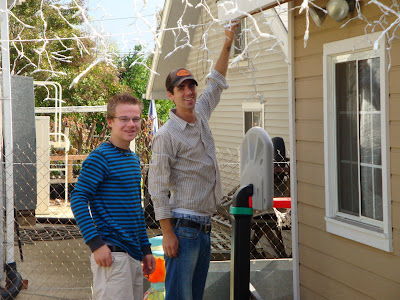 Hanging lights to eat Thanksgiving out in the backyard (but the weather did not cooperate, except for dessert)