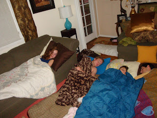 Where exactly did everyone sleep? Let’s see! If you move the chair into the foyer area, then there is room for three on the floor….they rotated who got the couch…and yes, they would not be too happy if they knew Mom snapped their picture in the wee hours…but from the left: Emmy, Graham, Abigail and Ryan….Dad and Mom got the bed and Liberty and Isaiah were on the floor in our room….It worked….next time some will be in the kitchen on the floor….