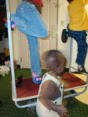 3. Gotta love the creative~ness needed to entertain in a small area! Who needs toys!