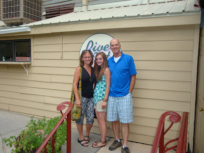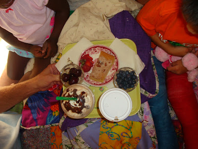 Breakfast was a bowl of cherries, a bowl of blueberries, my homemade Jewish Mother Coffee Cake (Emmy’s favorite) and a Peppermint Mocha Frappacino. Lunch at her favorite place with mom & dad (again, the River Rat) where we watched rafters float by….Dinner was take-out from the Chinese restaurant…… Autumn (Polly) and Emmy