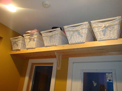 Notice the bit of shelving above in this picture….. It holds 5 BIG baskets…one for gloves/mittens….one for hats……one for craft stuff….etc….and although they are up over our heads…super easy….just keep the basket down while needed, while not in use, put up out of the way….