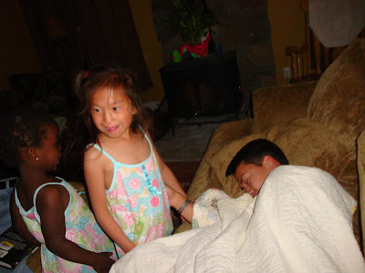 Dw, Graham and Tyler arrived late Wednesday night after all the little guys were asleep. Tyler ran upstairs and tried to rouse them. It was pretty funny. Elizabeth and Jubilee didn’t stir. Tyler said to Elijah, “Ty’s home.” Elijah didn’t open his eyes, but lay limp and opened his mouth just a tiny circle and said, “oh”. We really laughed. Isaiah barely opened his eyes and smiled. Liberty did hug him and fell back on her pillow. Konked, or what? Ty was bummed.