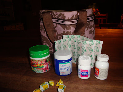 Anyway, so to simplify my life I bought two adorable little purses at a yard sale for about $.25 each. In each little purse is the off-brand of each of these items: Neosporin, Band-aids, Tylenol, Vicks Vapor rub, a few cough drops, Pamprin. the babies “Africa” lotion and some sanitary pads…..
