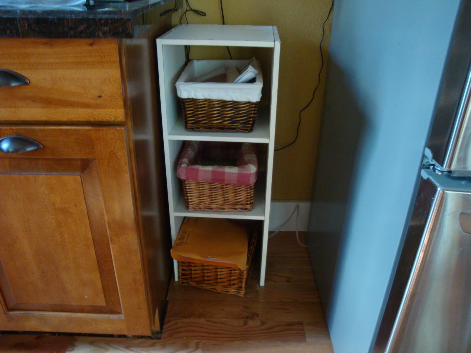 For example: I have my computer at the end of the counter top, but there is a space between the end of the counter and the fridge, because things just didn’t work out quite like I had planned. So the question became: What to do with that space? I went back to Home Depot and they priced a cabinet. Whoooa. It was like $500. I thought, ‘well maybe the contractor who redid the laundry room could build a little set of shelves’, but even that would be more than what I thought we should spend.