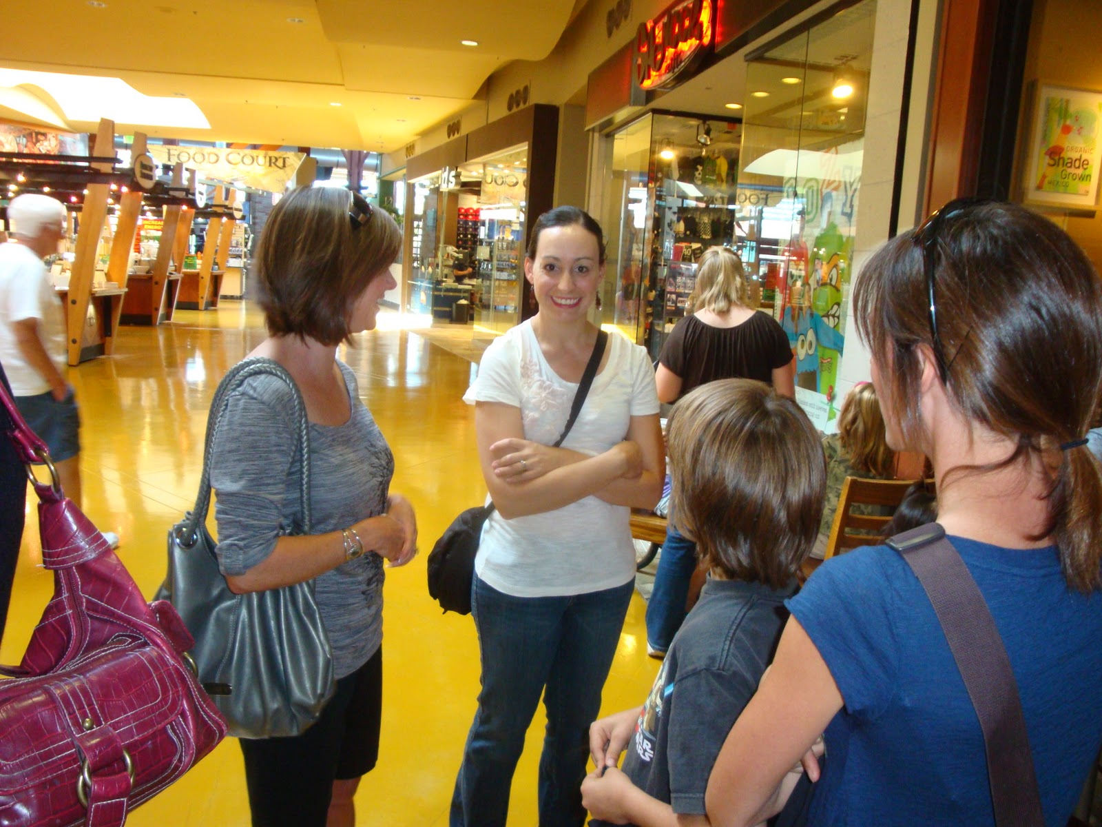 We’d been mingling for awhile and I noticed a young woman across the mall at the Cinnabon’s surrounded by a bunch of little ones.  She looked over at all of us.  I saw her look several times.