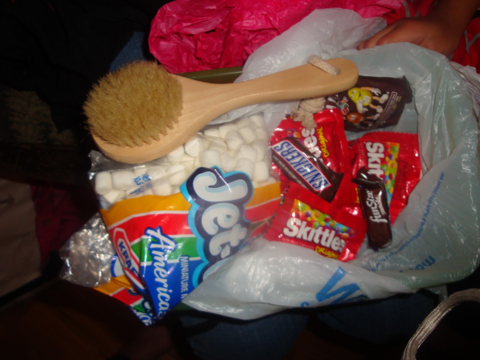 He gathers stuff from around the house….this time he hit the pantry and found skittles, Snickers, marshmallows and a brush from who-knows-where!!