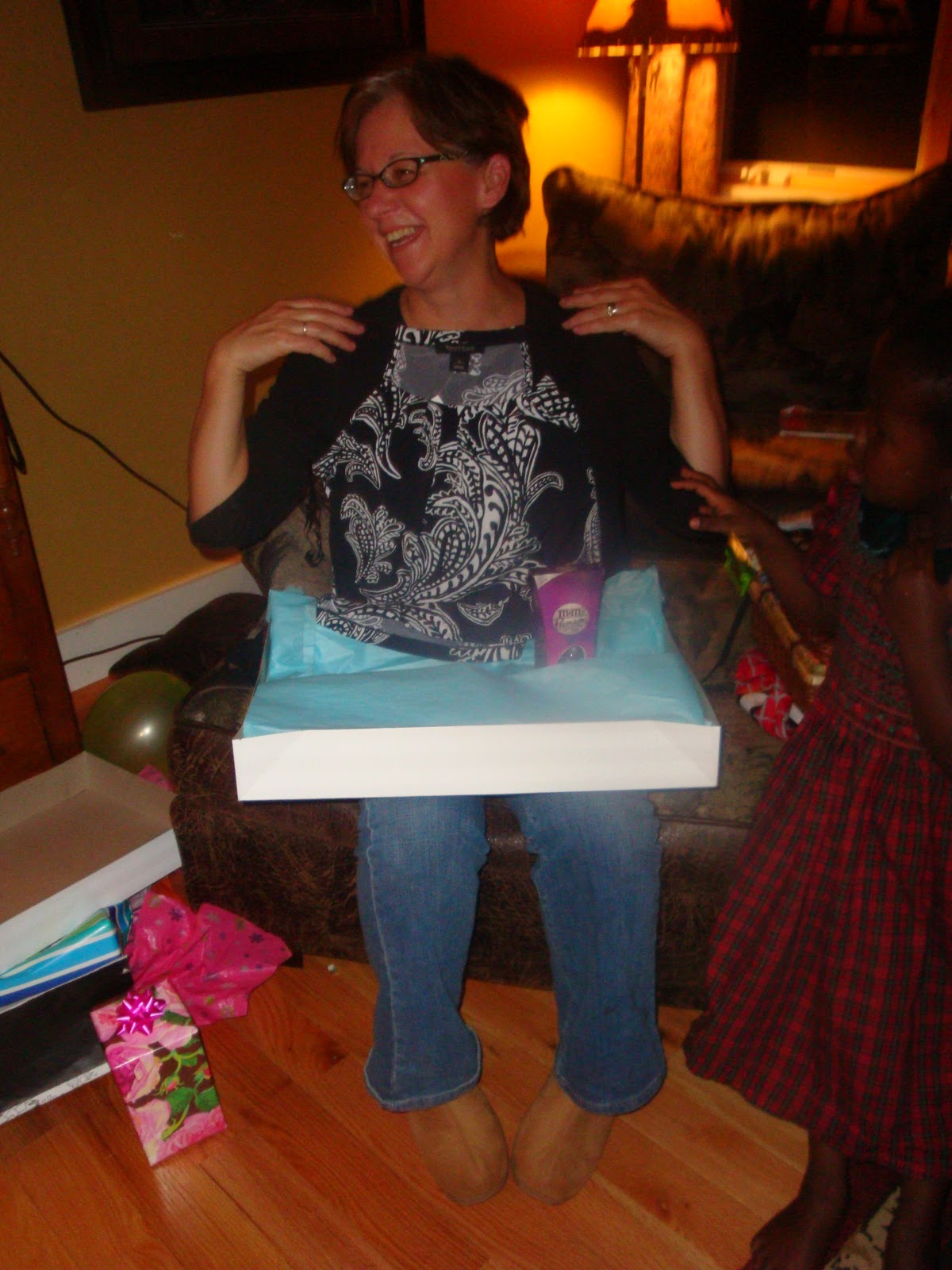 4. You do deserve to have wonderful celebrations! I am loving what the children came up with and their creative packaging! They know exactly what you like … cell phones, comfortable clothes, and because you love the mask (on your little man) he thought you would like that, also. Blessed you are!!