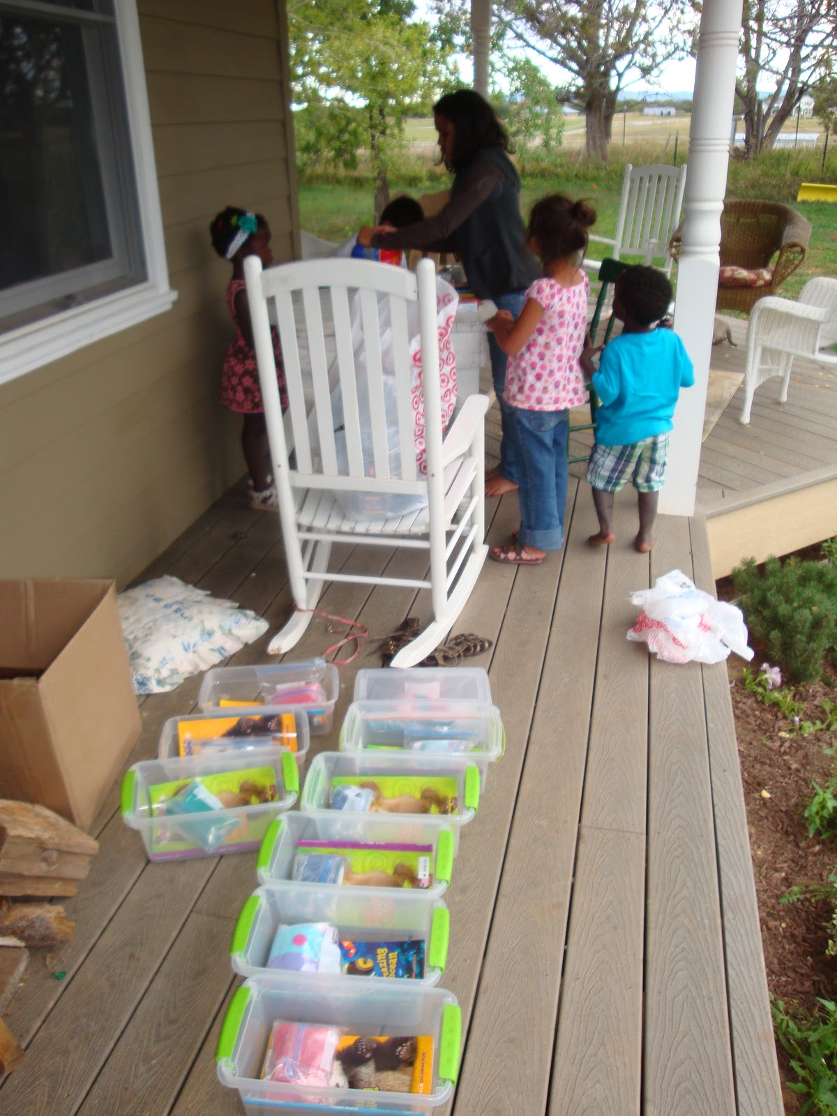 13. my mom and I and my sister did 45 this year! we shop all yr long and make as many as we can. one yr we made 178! it's so fun. and then after halloween the candy goes on sale for 75 % off and we really stock up!! our FAVORITE thing to put into boxes is clothes and SOCCER BALLS!! my mom sewed about a dozen little girls sundresses for our boxes this year. this yr we have TONS of toys left but ran out of soap, facecloths, crayons ect so we'll save the toys for next yr.