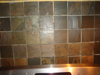 And so for the last three days they have ripped out my granite tiles and installed rustic, uneven, crazy slate tiles. They cut them in small pieces and put them behind the stove.