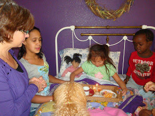 So this morning when I came in with the tray and the lit candle I so wish I had had my camera on.  For the past year she has watched as everyone has had a birthday and breakfast in bed.  This morning her expression was indescribable….it looked as though she was saying, “ME?  I didn’t know I would get breakfast in bed.  I never thought it would be my turn.  I can’t believe I deserve it.”  Really, her expression made my heart cry.