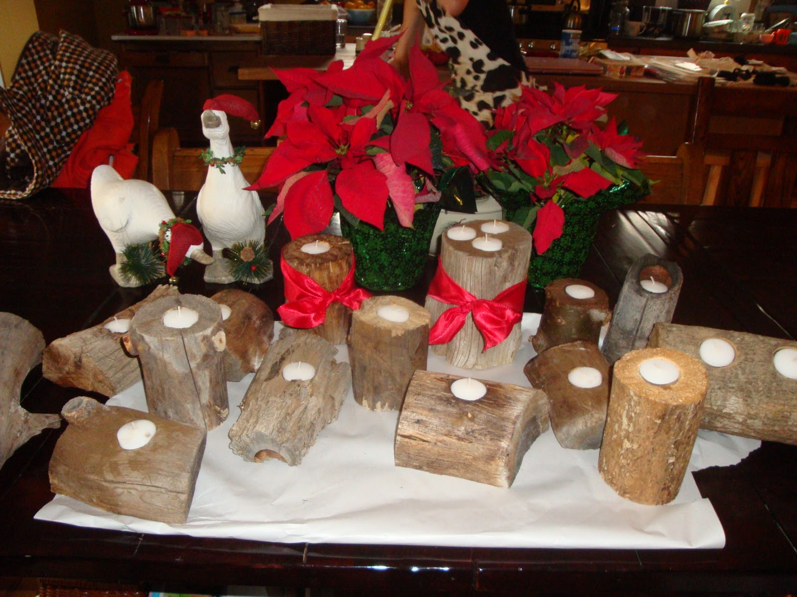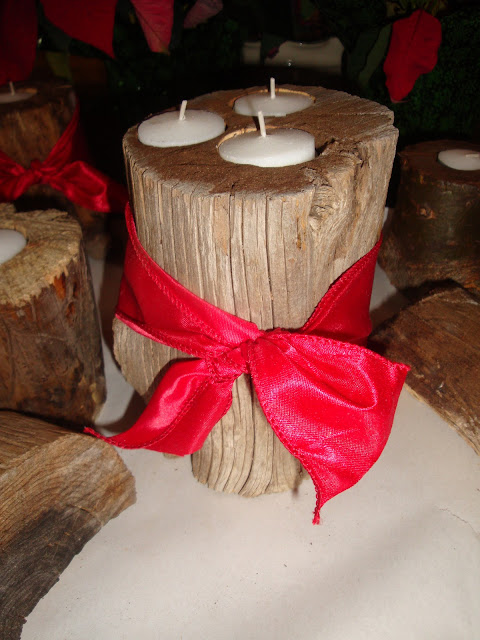 and the rest of us saw the pieces and we stain fresh ends and then we place little tea lights in the drill holes and put some ribbons on them..