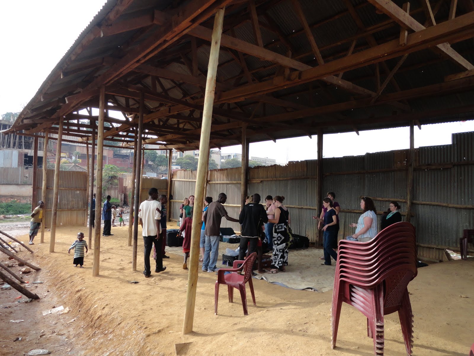 Emmy and I were in the second load of ladies and the first bunch had already started to get the area ready.  As we got to the slums there were crowds of street boys anxiously waiting – on roofs of the shacks that line the ‘road’, in the streets and even running beside the car!