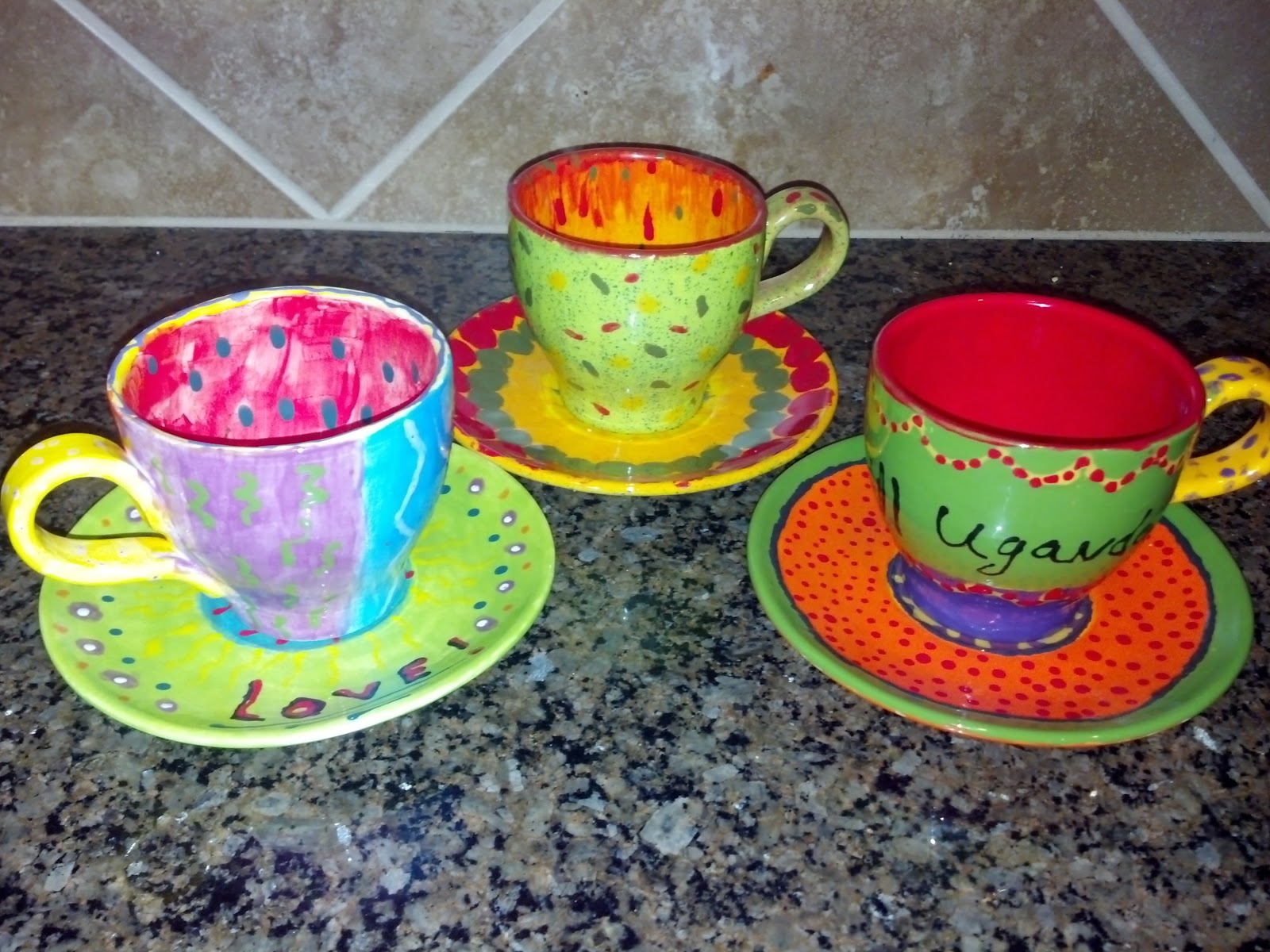 3. We love doing pottery!!! One of my most favorite memories is the time I took our oldest daughter away (well to a hotel in our hometown) for the weekend. We did Passport to Purity and our fun time out, was to a pottery place. We each made a small thing and then worked on a teapot together. We painted tiny little designs all over it. It took about 2 hours to complete. It is now displayed on our china hutch and each time I look at it it reminds me of our precious weekend together. By the way, LOVE the cups!!! The more color the better I say.