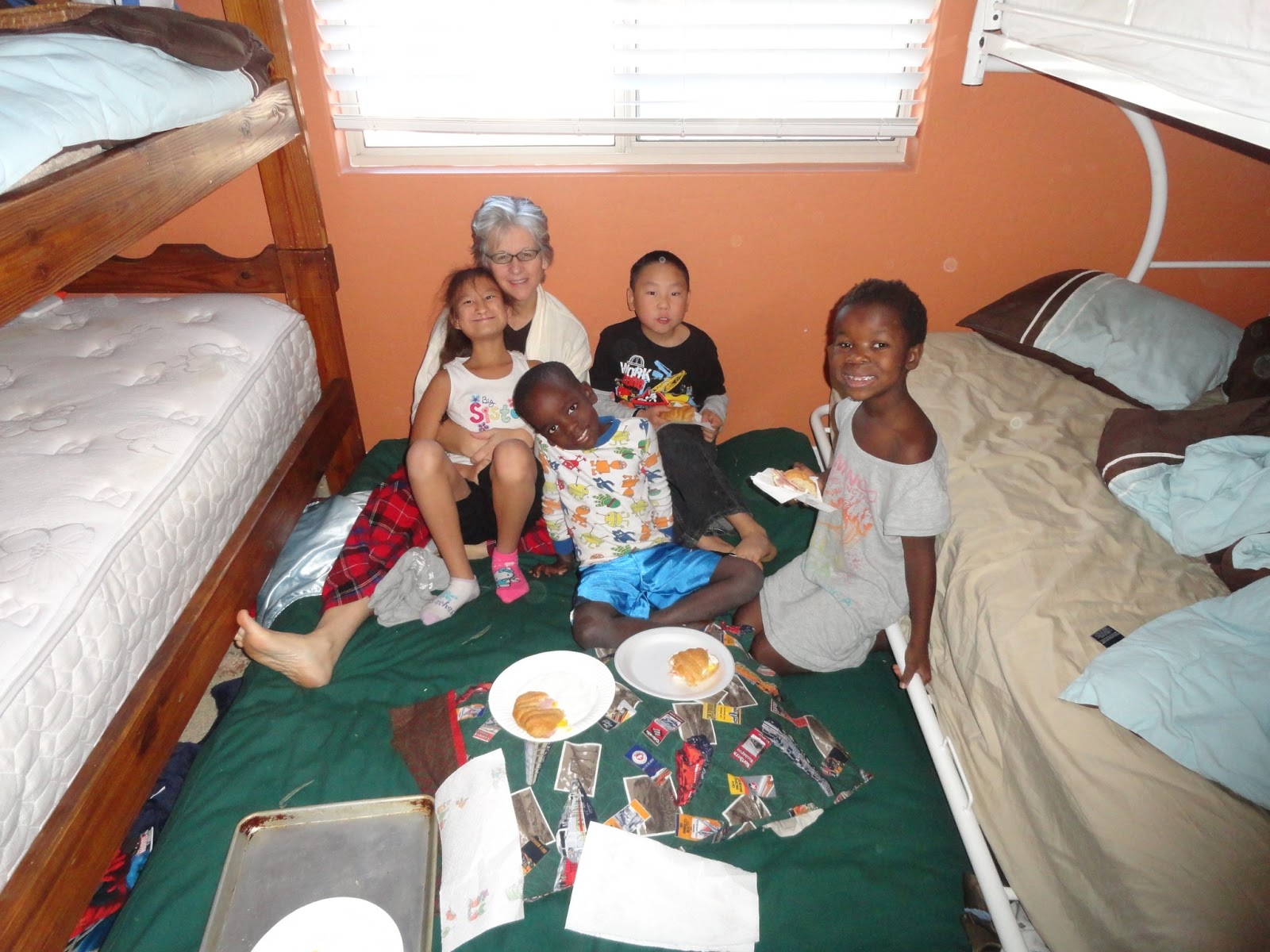 I threw open their door and found Nehemiah and Elijah jumping from bed to bed and Isaiah on his top bunk, jump roping with his sheet as a rolled up rope.
