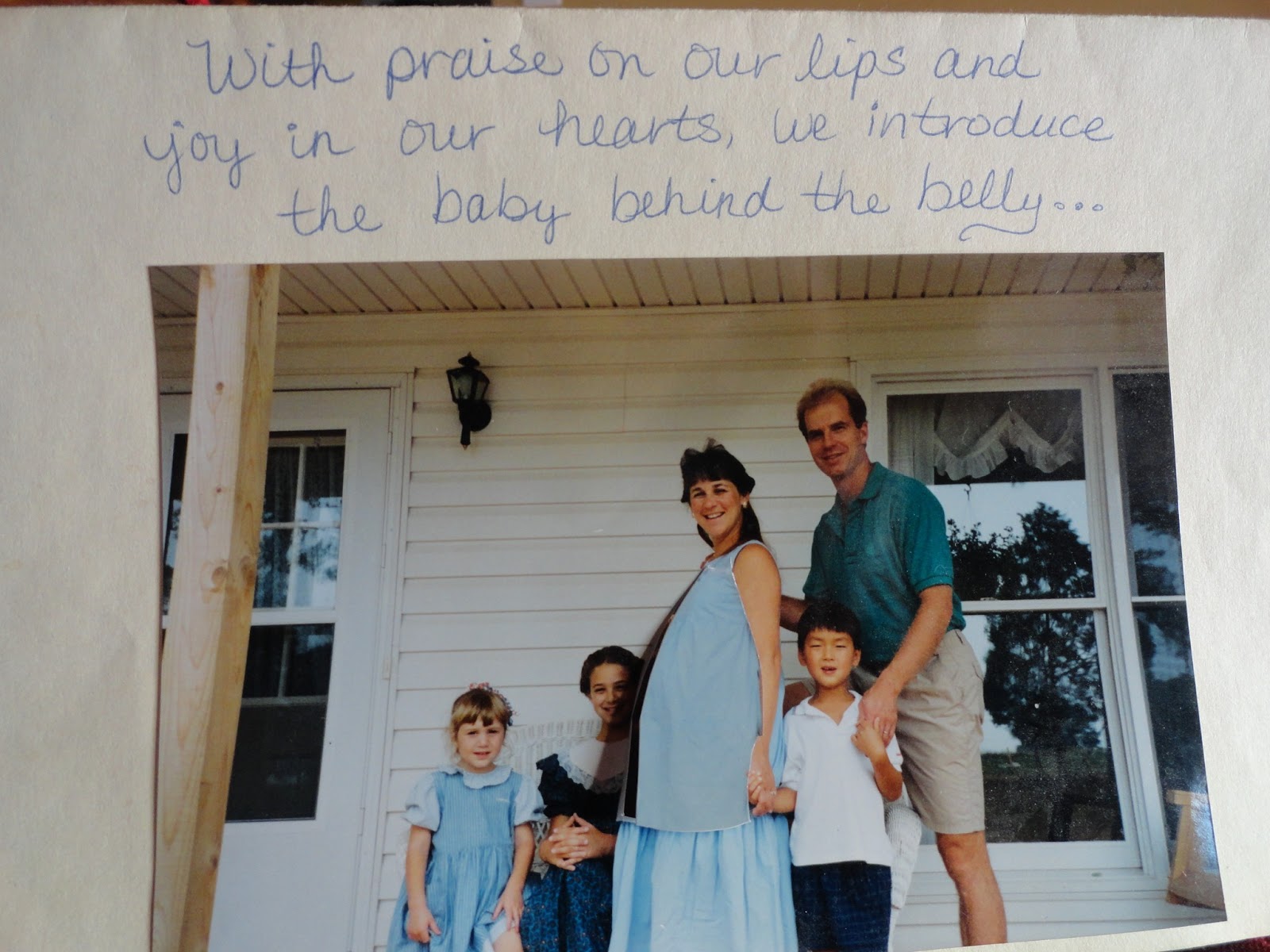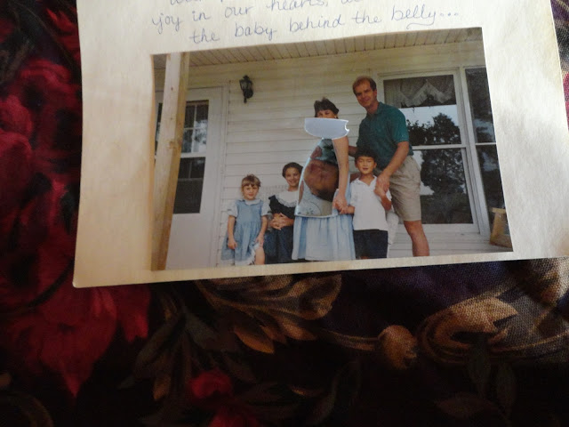 So I took a picture of my 8 month pregnant self…with Autumn, Abi, Dw and Tyler on our front porch…Then I gently glued it to a card stock piece of paper, and ever so carefully sliced the edge of my dress so that one could easily lift up the piece of my big ol’ belly…..