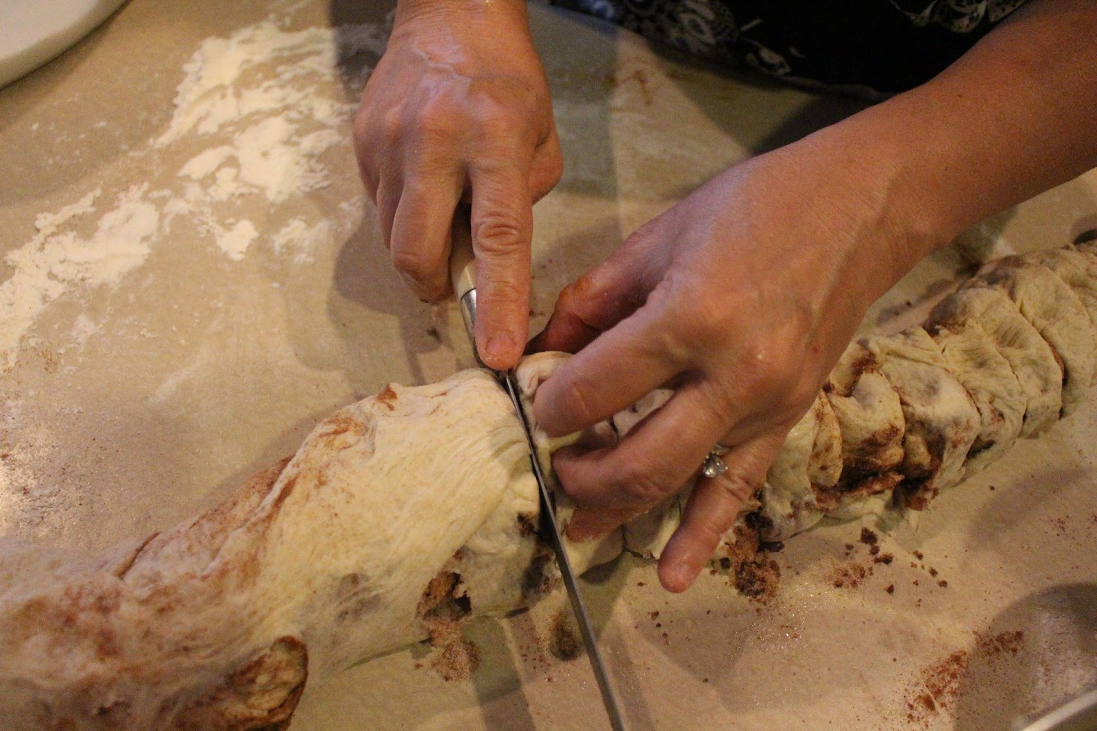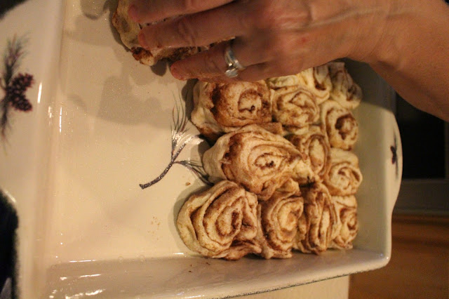 Your rolls look so good this morning :). A trick I was taught when cutting rolls is to take a piece of thread, slide it under the 'log' of dough and criss cross it across the top, pull string on both ends and it will slice right through the dough. Ahhh, so much easier for little hands to cut the rolls instead of a knife and stuggling with them falling apart. Thanks for sharing