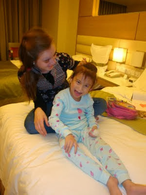 Emma doing Jubilee’s hair in the hotel in Tianjin.