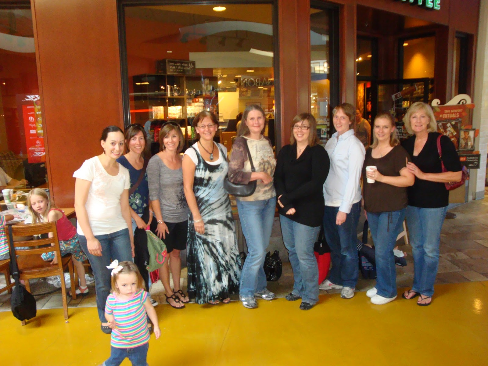 We’d been mingling for awhile and I noticed a young woman across the mall at the Cinnabon’s surrounded by a bunch of little ones.  She looked over at all of us.  I saw her look several times.