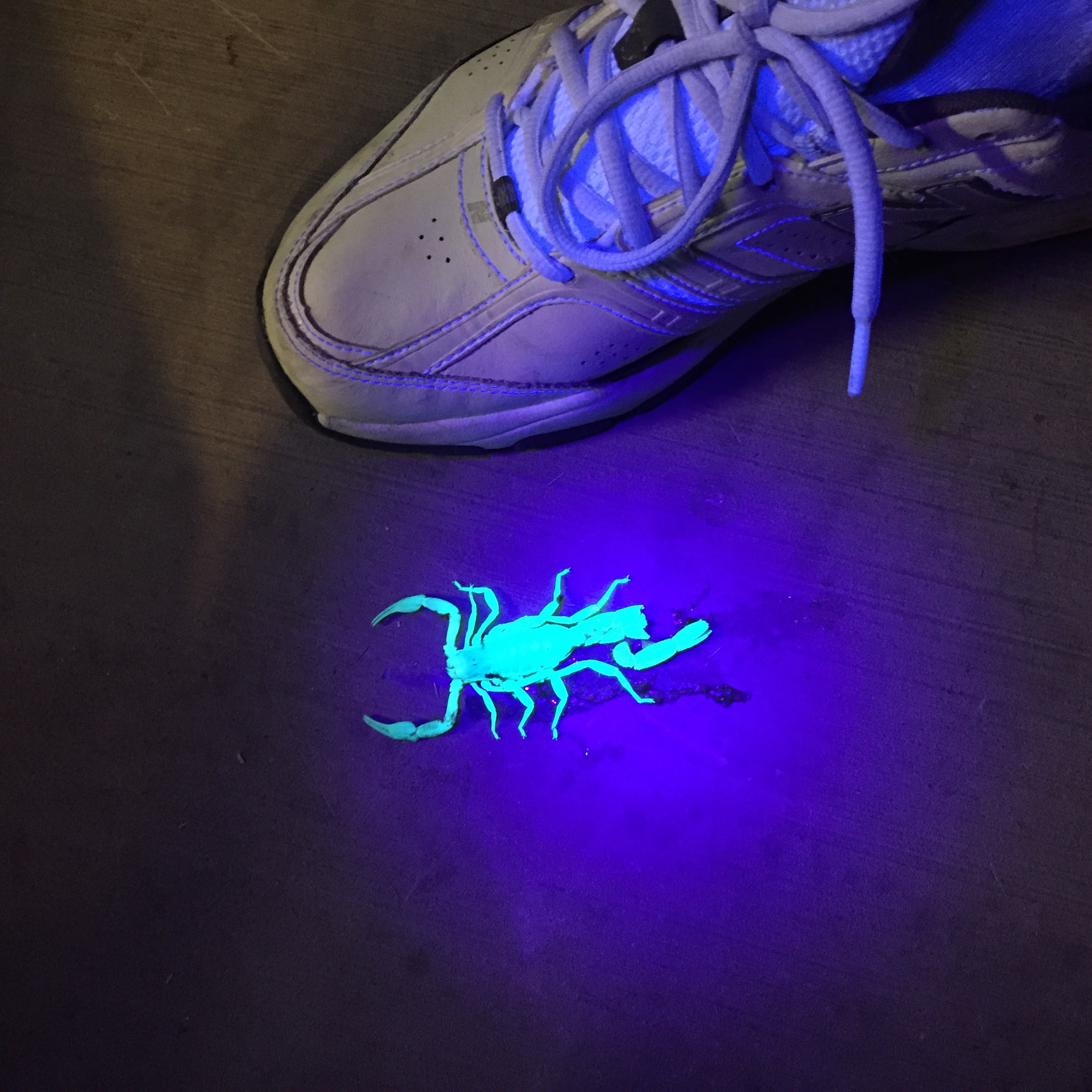 Bright (get it?) side note (that maybe those who’ve never lived in the desert don’t know).  Here’s the science behind it:  All scorpions fluoresce under ultraviolet light.  The blue-green glow comes from the substance found in the hyaline layer, a very thin but super tough coating in a part of the scorpion’s exoskeleton called the cuticle.  You don’t have to thank me for that cool science fact.